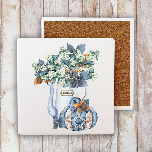 Autumn Blue White Pumpkins Flowers Stone Coaster
