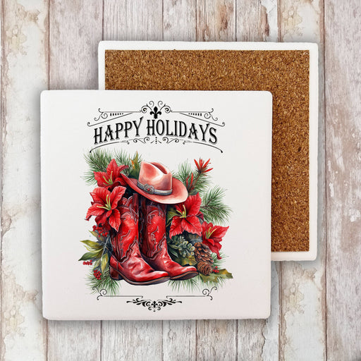 Christmas Holly Red Cowboy Boots Western Stone Coaster