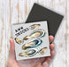Strong magnetic backing ensures a secure hold for photos, notes, or reminders. Comes package in a poly bag for display hanging. Designed and Printed in the USA.