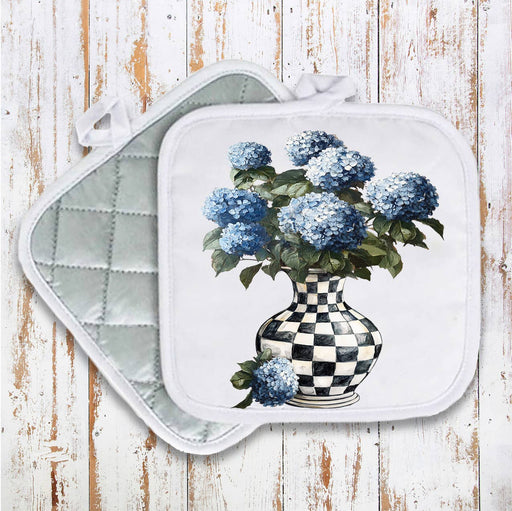Checkered Vase with Blue Hydrangeas Pot Holder Oven Mitt